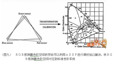 顏色的選擇相當(dāng)簡單,以上述的例子為例,目標(biāo)色D65以感測器電壓的方式指定,在實(shí)際應(yīng)用上,目標(biāo)色可以CIE 1931xyY系統(tǒng)的座標(biāo)指定,當(dāng)然也可採用如CIE?。酰觯倥cCIE?。遥牵碌绕渌氏到y(tǒng)。例如,要選擇照度E做為目標(biāo)色,只要將(x,?。?,?。伲剑ǎ常常?,?。常常?, 200)的值送到ASSP中適當(dāng)?shù)臅捍嫫骷纯赏瓿伞?br />