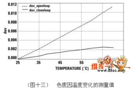 (圖十三)顯示了開回路與閉回路RGB光源系統(tǒng)的效能差別,實(shí)驗(yàn)采9000K白色目標(biāo)色進(jìn)行并使用duv做為評比指標(biāo)。