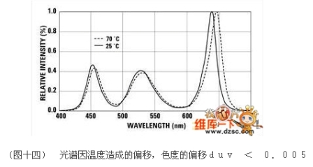 (圖十四)描述了溫度上升時(shí)對LED光譜的重大影響,這項(xiàng)資料由9000K白光目標(biāo)色的閉回路系統(tǒng)取得,雖然光譜曲線出現(xiàn)大幅度的偏移,但duv依然維持在0.005以下。