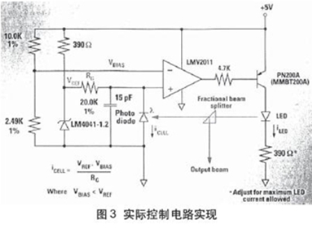 圖2示出采用運(yùn)放的電路,用于分析控制環(huán)路。此電路驅(qū)動(dòng)1個(gè)PNP晶體管,此晶體管為產(chǎn)生光發(fā)射的LED提供電流。光發(fā)射照射到光電二極管,光電二極管把光發(fā)射轉(zhuǎn)換為非常小的電流(通常為10mA)。在這種情況下,二極管用在反向模式,所以在無光呈現(xiàn)時(shí),電流為零,但是光電二極管和放大器中的漏電流(也稱之為“暗電流”)是過載。此條件牽引由晶體管基極電阻所限制的電流,開始時(shí)晶體管處于飽和狀態(tài)。一旦電流開始流經(jīng)晶體管,則LED或激光二極管將開始發(fā)射光。光電二極管把此部分光轉(zhuǎn)換為電流,流經(jīng)RG。隨著電壓趨于VBIAS(在圖2中為地),環(huán)路將閉合并保持驅(qū)動(dòng)晶體管的電流來維持LED中的電流以保持恒定光強(qiáng)度(或光電二極管中的電流)。此構(gòu)成電路DC分析的基礎(chǔ)。圖3為用NS公司LMV2011精密運(yùn)放實(shí)際實(shí)現(xiàn)電路。用NS的LM4041-1.2并聯(lián)基準(zhǔn)產(chǎn)生基準(zhǔn)電壓,提供固定的1.225V基準(zhǔn)電壓。設(shè)置基準(zhǔn)中的電流在10mA左右,這是工作電流的中間值。由兩個(gè)1%精度電阻器產(chǎn)生VBIAS,其值設(shè)置在1V左右。為了計(jì)算閉合控制環(huán)路中的光電二極管電流,VREF和VBIAS之差除RG。注意,為了此電路工作,VBIAS必須小于VREF。對(duì)于10mA光電二極管電流,RG為0.2×10E-6或 20.0KΩ。4.7KΩ電阻器限制PN200A PNP晶體管基極電流,設(shè)置在1mA左右。晶體管b值為100左右,所以晶體管可提供的最大電流為100mA左右,這超過了微型SOT-23封裝的熱耗。為了避免晶體管的熱擊穿,用與LED或激光二極管串聯(lián)的電阻器限制晶體管集電極電流。若需要更大電流,則具有較大集電極電流的晶體管應(yīng)該用較大的封裝(如SOT-223)。為限制電路帶寬以保持穩(wěn)定性,用與光電二極管并聯(lián)的15pF電容器使放大器滾降頻率在250KHz左右。