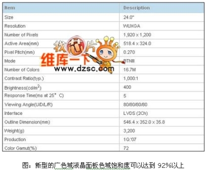 新型的W-CCFL(廣色域背光燈管)能夠相當(dāng)程度的改善色域呈現(xiàn)問題,有效加強(qiáng)顏色飽和度,如果搭配新型的多色濾光片(在RGB三原色以外多加如黃色、青色或白色等顏色的濾光片,借以增加顏色呈現(xiàn)能力),在顯示能力上還能夠進(jìn)一步提升。濾光片對(duì)色域表現(xiàn)有所幫助,但是幅度不大,影響色域呈現(xiàn)能力主要還是在背光模組技術(shù)方面。W-CCFL只是在螢光材質(zhì)進(jìn)行改良,僅僅更換W-CCFL背光模組,就能將色域飽和度從原本的72%NTSC提升到92%NTSC的程度,且?guī)缀醪粫?huì)增加成本,因此各大液晶監(jiān)視器或液晶電視制造公司也開始大幅采用此種背光技術(shù),只要是色域范圍在NTSC90%左右者,幾乎都是此類燈管。
