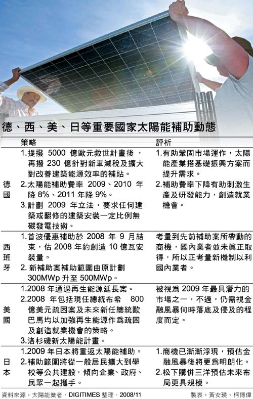 搭配各州政府自己擬定的太陽能補助政策及聯(lián)邦政府延長的太陽能補助案,目前全美有許多州都在擬定這類的太陽光電補助計劃,其中又以加州最積極;似乎一切都就緒,就等待金融風暴落底。