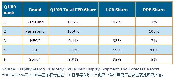 有部分品牌廠商在2008年停止采用等離子面板做為公眾顯示系統(tǒng)應(yīng)用,對于等離子陣營造成了一些傷害;不過主要等離子廠商如Panasonic仍是非常專注于等離子面板于公眾顯示領(lǐng)域的應(yīng)用,我們相信這些主要廠商的投入,對于等離子未來在公眾顯示領(lǐng)域的發(fā)展仍會有一定影響力。根據(jù)DisplaySearch第一季出貨調(diào)查指出,Samsung為整體公眾顯示器不分技術(shù)別出貨冠軍,而Panasonic排名第二,不過Samsung主要是采用液晶顯示器,而Panasonic則100%采用等離子顯示器。