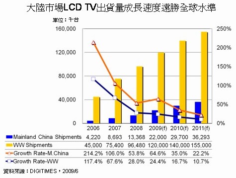 中國大陸LCD TV出貨增長速度遠高于全球平均水平(資料來源:DIGITIMES Research,2009年6月)
