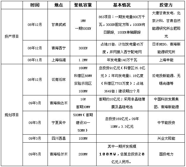 受國家政策的導(dǎo)向,從2008年底到2009年上半年,全國上馬了多個大型并網(wǎng)電站項目,如青海柴達(dá)木的1GW光伏電站項目、青海格爾木的 200MW光伏電站項目、寧夏吳中的500MW光伏電站項目等,盡管目前國家只批準(zhǔn)了三個光伏電站項目包括上海崇明島1MW項目、255千瓦的內(nèi)蒙古鄂爾多斯項目和甘肅敦煌的100MW項目,而以上新上馬的項目還有待國家的批復(fù)。