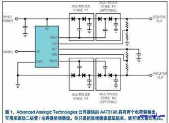 AdvancedAnalogicTechnologies公司的副總裁JanNilsson評述道:“許多手機(jī)、數(shù)碼相機(jī)及其它便攜式設(shè)備中的有源矩陣LCD和OLED……子系統(tǒng)要求正負(fù)兩種小電流偏置電源。”這種情況使得電源前景復(fù)雜化。AdvancedAnalogicTechnologies公司推出的AAT3190能滿足這種需求,因?yàn)樗柚粔K采用自同步雙電荷泵體系結(jié)構(gòu)其工作于標(biāo)稱1MHz的開關(guān)頻率芯片來生成正負(fù)兩種電源(圖1)。這種電荷泵可利用2.7V~5.5V的單極性輸入電源產(chǎn)生最大可達(dá)±25V的可調(diào)輸出電壓。