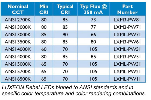 這九款新的LUXEON Rebel LED產(chǎn)品根據(jù)美國國家標(biāo)準(zhǔn)化組織(ANSI)的標(biāo)準(zhǔn)進(jìn)行電阻分檔,均達(dá)到了最低規(guī)定演色系數(shù)。每一款產(chǎn)品的光輸出和光通維持率均達(dá)到了ENERGY STAR®和其他光效標(biāo)準(zhǔn)。另外,新產(chǎn)品也具備其他LUXEON Rebel系列產(chǎn)品所公認(rèn)的高效,長使用壽命及高可靠性的特點(diǎn)。