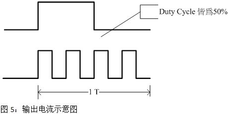 解決LED熱的問題及增加LED的壽命如圖5所示為50%Dutycycle的電流輸出示意圖,若在同一個(gè)時(shí)間內(nèi)將出電流的脈沖平均打散,不但不影響輸出電流及LED的亮度也可以避免LED長(zhǎng)時(shí)間的點(diǎn)亮造成LED過熱及壽命提早衰減的現(xiàn)象。[page]