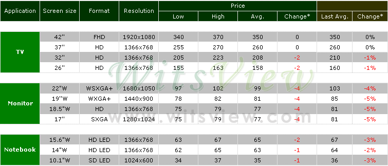 9月份筆記本電腦面板需求受惠于Windows 7新機(jī)鋪貨,下游客戶訂單量仍維持一定的水準(zhǔn),面板價格有漲有跌,上下幅度約1~2美元,一線品牌客戶價格壓力較大,在10月的面板需求將較9月份減少的影響下,估計面板價格跌幅將擴(kuò)大至2-3美元;9月份液晶電視面板價格則大致維持穩(wěn)定,小尺寸26W及32W面板在少數(shù)客戶端的價格微幅下調(diào)2~3美元,40W以上則大都持平,大陸十一國慶長假的銷售成為市場關(guān)注的焦點,銷售結(jié)果將左右10月份電視面板價格的走勢,另一方面,由于監(jiān)視器面板產(chǎn)能已經(jīng)松動,因此估計小尺寸電視價格走勢將受牽連,下跌幅度約5-10美元。