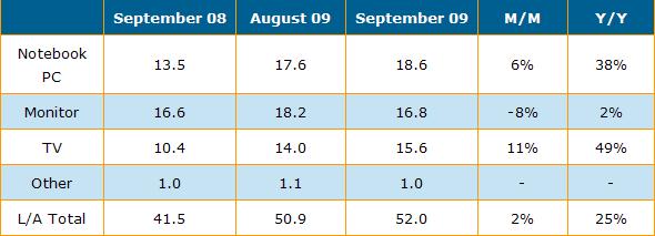 以下摘錄DisplaySearch 9月份液晶面板出貨數據調查部份重點: