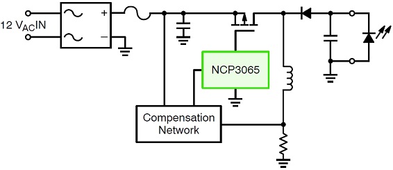 這參考設(shè)計的一項(xiàng)關(guān)鍵考慮因素,是在12 Vac輸入條件下,跨輸入線路變化及輸出電壓變化,實(shí)現(xiàn)平坦的電流穩(wěn)流。這參考設(shè)計電路基于安森美半導(dǎo)體的NCP3065構(gòu)建,工作頻率約為150 kHz,采用非隔離型配置。NCP3065是一款單片開關(guān)穩(wěn)壓器,支持12 Vdc或12 Vac電源輸入,設(shè)計用于為HB-LED提供恒定電流。除了NCP3065,這參考設(shè)計還結(jié)合了自動檢測電路。這參考設(shè)計的功能框圖如圖1所示。