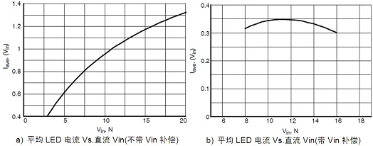 圖2:不帶Vin補(bǔ)償及帶Vin補(bǔ)償時的平均LED電流vs. Vin曲線