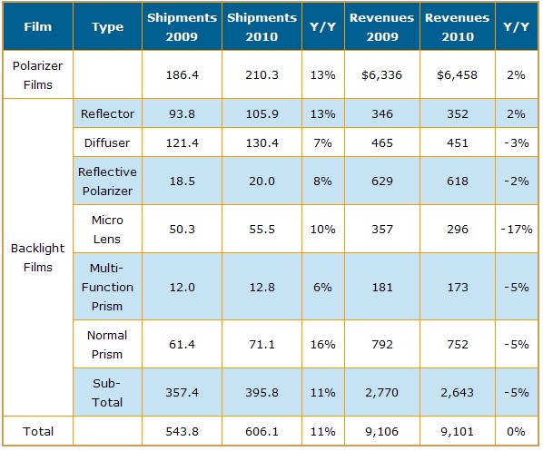根據(jù)DisplaySearch在光學(xué)膜領(lǐng)域調(diào)研指出,2009年全球TFT LCD用光學(xué)膜出貨面積估計達到5億4千3百萬平方米,同時預(yù)估2010年光學(xué)膜出貨將持續(xù)增長到6億零6百萬平方米,年成長率將達11%。不過由于平均銷售價格不斷下滑,我們估計2010年出貨金額將與今年持平在91億美元水平。另一方面隨著綠色顯示器需求與LED背光市場增長驅(qū)動新一波背光設(shè)計發(fā)展,使得如棱鏡片(prism films)、反射式偏光片(reflective polarizers)或者micro-lens films等產(chǎn)品的需求也跟著提高;對于能持續(xù)提高技術(shù)能力的廠商提供較佳市場機會。