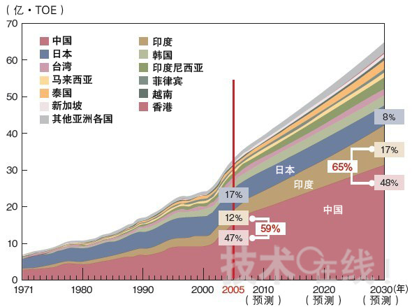 當(dāng)然,印度的能源需求也在持續(xù)增加。截至2005年,印度的能源需求占整個(gè)亞洲的12%,僅次于中國、日本,位列第三。而到2030年,這一數(shù)字估計(jì)將達(dá)到17%,超越日本,成為亞洲第二(圖1)。
