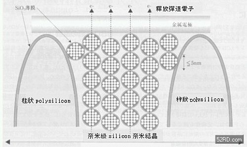 接著在玻璃基板上制作金屬電極,并將金屬電極上方的柱狀polysilicon膜層浸泡于氟酸與乙醇混合液內(nèi),同時(shí)施加電壓至混合液內(nèi)的白金負(fù)極,與polysilicon膜層的正極,進(jìn)行類似電界研磨加工。由于silicon在某些條件下無法進(jìn)行研磨,反而會(huì)產(chǎn)生silicon的奈米結(jié)晶,這種特殊現(xiàn)象主要是因?yàn)橹鶢頿olysilicon的grainboundary的結(jié)合能量很低,使得該部份發(fā)生反應(yīng)析并出silicon,在此同時(shí)被析出的silicon會(huì)進(jìn)行再結(jié)晶化,最后形成如圖1所示的奈米結(jié)構(gòu),這種被稱為自我組織的獨(dú)特現(xiàn)象發(fā)生與否,完全取決于制程條件的設(shè)定。