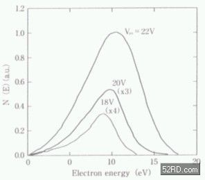 圖2是釋放至真空中的電子能量分佈量測(cè)結(jié)果,圖中的x軸為電子能量,y軸為釋放電子的相對(duì)數(shù),測(cè)試時(shí)的基準(zhǔn)能量是比照真空狀態(tài)時(shí)的準(zhǔn)位,測(cè)試方法是在室溫下進(jìn)行,採用一般性的交流減速電界法。假設(shè)表面金屬的動(dòng)作關(guān)數(shù)為ψ(eV)時(shí),完全未發(fā)生沖突釋放出去的電子最大能量,理論上幾乎等于施加電壓減去動(dòng)作關(guān)數(shù)ψ的能量,以圖2為例假設(shè)VPS=22V時(shí),雖然分佈的最大能量-Vmax祇有17eV,不過表面電極的動(dòng)作關(guān)數(shù)大約有5eV,換言之它與上述施加電壓減去動(dòng)作關(guān)數(shù)的結(jié)果完全一致,由此驗(yàn)證BSD具有獨(dú)特的彈道電子釋放特性。實(shí)際上在室溫環(huán)境下NPS層多少會(huì)發(fā)生沖突,一般是將它視準(zhǔn)彈道電子的釋放。