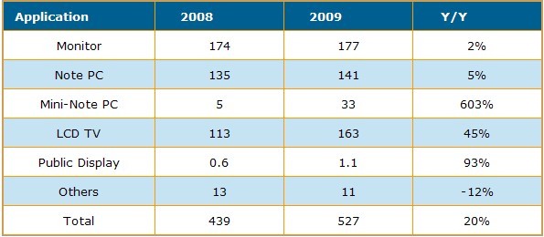 雖然液晶顯示器對(duì)大尺寸液晶面板而言是一個(gè)較成熟的市場(chǎng),2009年出貨量?jī)H較2008年成長(zhǎng)2%,而與2007年相同。筆記型計(jì)算機(jī)與迷你筆記本電腦用面板合計(jì)出貨達(dá)一億7千500萬(wàn)片,2009年年成長(zhǎng)率約25%。電視面板表現(xiàn)最為亮眼,出貨量成長(zhǎng)45%,達(dá)1億6千300萬(wàn)片。另外,公眾顯示器面板出貨成長(zhǎng)93%,從90萬(wàn)片成長(zhǎng)到110萬(wàn)片。