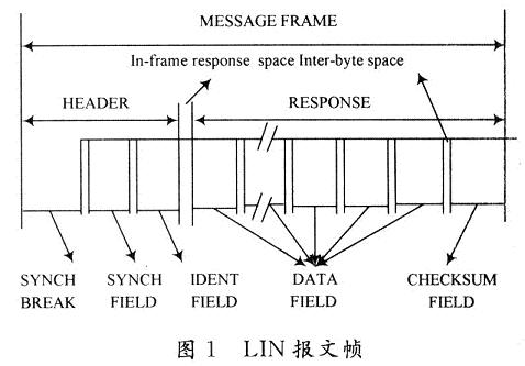 報文幀的報文頭包括一個同步間隔場(SYNCHBREAKFIELD)、一個同步場(SYNCHFIELD)和一個標識符場(IDENTITYFIELD)。報文幀的響應(yīng)(RESPONSE)則由3~9個字節(jié)場組成:2,4或8字節(jié)的數(shù)據(jù)場(DATAFIELD)和1個字節(jié)的校驗和場(CHECKSUMFIELD)。字節(jié)場由字節(jié)間空間分隔,報文幀的報文頭和響應(yīng)是由一個幀內(nèi)響應(yīng)空間分隔。最小的字節(jié)間空間和幀內(nèi)響應(yīng)空間是0。