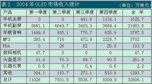OLED已進入的產品領域包括手機主屏和副屏、汽車音響、MP3、工業(yè)儀表、PDA、車載儀表、數(shù)碼相機和微顯示器(MicrodisplayforNearEyeApplication)等領域。其中,手機副屏約為2.2億美元,占67%,汽車音響約為0.38億美元,占11.6%,MP3屏為0.37億美元,占11.3%,這三者共占了約90%。
