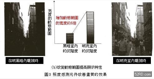 有關(guān)液晶電視的應(yīng)用,主要是液晶顯示器的點(diǎn)燈時(shí)間越久消費(fèi)電力就越大,相對(duì)的散熱處理與散熱風(fēng)扇的噪音則變成非常棘手的問(wèn)題,尤其是目前大型液晶電視的輝度大多超過(guò)時(shí),在明亮室內(nèi)畫(huà)面非常的亮麗,不過(guò)在黑暗室內(nèi)卻會(huì)出現(xiàn)波紋現(xiàn)象,而且畫(huà)面太亮容易造成眼睛疲勞,黑暗色影像的黑色浮動(dòng)現(xiàn)象非常明顯,影像對(duì)比則大幅降低。由于一般液晶電視是根據(jù)各畫(huà)素的液晶穿透率,調(diào)整背光模組的光線達(dá)成灰階化顯示目的,然而過(guò)多的背光模組光量卻有漏光之虞,如果利用照度感測(cè)元件偵測(cè)液晶電視視聽(tīng)環(huán)境的亮度,依此調(diào)整背光模組的輝度,除了影像黑色浮動(dòng)之外,灰階數(shù)相同的條件下還可以縮小亮度的動(dòng)態(tài)范圍(dynamicrange),進(jìn)而提高黑色影像表現(xiàn)能力(圖3(b)),并降低最大輝度解除影像太亮的困擾,這意味著觀賞液晶電視時(shí),消費(fèi)者不會(huì)受到視聽(tīng)環(huán)境的影響,隨時(shí)可以獲得細(xì)膩的影像。