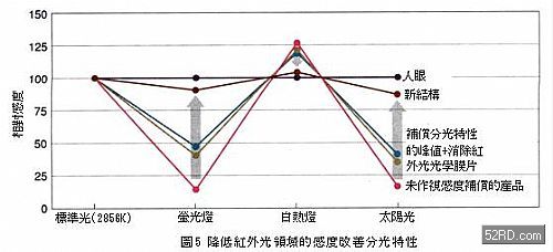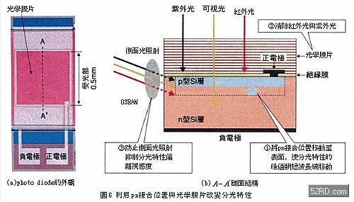 如圖6所示,分光特性可透過(guò)照度感測(cè)元件結(jié)構(gòu)上的改良獲得調(diào)整,基本上它是改變的接合位置(吸光產(chǎn)生電力),同時(shí)配合分光特性的峰值利用光學(xué)濾光片(filter)去除紫外光與紅外光。新日本無(wú)線根據(jù)上述動(dòng)作原理進(jìn)行分光特性最佳化設(shè)計(jì),再以光罩(mask)遮斷從光二極管側(cè)面入射的光線,藉此捨棄光學(xué)濾光片傳統(tǒng)結(jié)構(gòu);德國(guó)OSRAM則採(cǎi)用新材質(zhì)與新結(jié)構(gòu),未使用傳統(tǒng)的改善對(duì)策,大幅提升照度感測(cè)元件的分光特性。