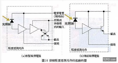 由于照度感測(cè)元件受光時(shí)會(huì)消耗電力,因此利用電池驅(qū)動(dòng)的電子設(shè)備,尤其是可攜式電子產(chǎn)品為抑制電池的消耗電力,所以大多採(cǎi)用間斷式驅(qū)動(dòng)照度感測(cè)元件,然而照度感測(cè)元件的電源電壓頻繁的ON/OFF動(dòng)作,對(duì)PhotoIC而言起動(dòng)時(shí)間最少需要,這段期間卻形成所謂的「電力損失」,因此東芝公司針對(duì)上述問(wèn)題,常時(shí)對(duì)增幅電路施加電壓,同時(shí)在增幅電路后段設(shè)置切換電路(圖10),試圖藉此電路縮短起動(dòng)時(shí)間并降低消耗電力,根據(jù)測(cè)試結(jié)果顯示消耗電力是傳統(tǒng)元件一半以下。