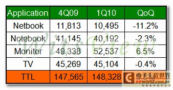 展望2010年第二季,WitsView認(rèn)為第一季過度樂觀的出貨表現(xiàn),使得主要應(yīng)用別的下游市場均存在庫存升高的疑慮,雖然目前仍未出現(xiàn)一線品牌明顯的砍單效應(yīng),但從4月下旬面板價格已出現(xiàn)小幅度下跌的指針來看,支撐出貨量持續(xù)攀升的動能將有可能趨緩,因此WitsView現(xiàn)階段保守預(yù)估第二季整體面板出貨量僅將小幅成長2%,未來品牌大廠需求減少幅度將為關(guān)鍵。