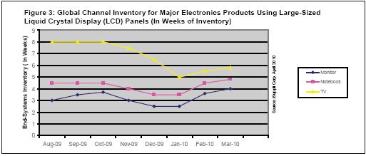 雖然庫存上升,但美國市場上的液晶電視庫存仍保持正常至健康的水平,有利于電視廠商清理舊型號產(chǎn)品和增加新產(chǎn)品。但是,中國市場的電視渠道庫存現(xiàn)在多于兩周,高于正常水平。這導(dǎo)致出現(xiàn)減少面板訂單的現(xiàn)象,4月面板需求走軟,尤其是來自中國的需求。