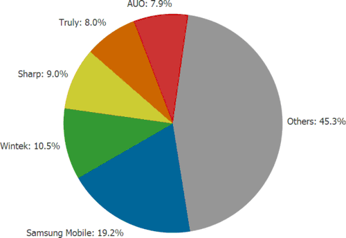 下圖顯示了全球前5大手機(jī)面板供貨商的市占率,前五大廠商占有超過一半市場(chǎng)。三星排名第一,2009年出貨量市占率達(dá)19.2%,其次是勝華科技市占率10.5%,夏普排名第三市占率9.0%,信利與友達(dá)以8.0%及7.9%市占率分居第四與第五位 。