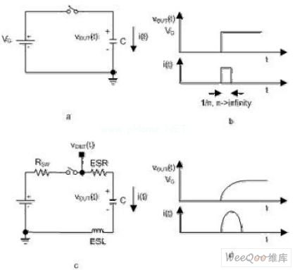 實際的電容具有等效串聯阻抗(ESR)和等效串聯電感(ESL),兩者都不會影響到電容存儲電能的能力。然而,它們對開關電容電壓轉換器的整體轉換效率有很大的影響。實際電容充電的等效電路如(圖1c)所示,其中RSW是開關的電阻。充電電流路徑具有串行電感,通過適當的器件布局設計可以降低這個串行電感。