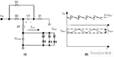白光LED通常由一個恒定直流電流源驅動,以保持恒定的亮度。在采用單顆鋰離子電池供電的便攜式應用中,白光LED以及電流源上的電壓降之總和可以比電池電壓更高或更低,這意味著白光LED某些時候需要對電池電壓進行升壓。完成這樣應用的最好辦法是使用升壓DC-DC轉換器。這種方法可以大大地優(yōu)化效率,但代價是成本和PCB面積增加。另外一種提升電池電壓的方法是使用電荷泵,也稱為開關電容轉換器。本文將詳細地分析這種器件的工作原理。