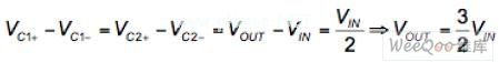 [page]輸出電容CHOLD提供輸出負載電流。隨著這個電容的放電,輸出電壓降低到期望的輸出電壓以下,第二個階段是被激活來將輸出電壓增高到這個值以上。在第二階段,C1和C2并聯,連接在VIN和VOUT之間。開關S4到S7關閉,而S1到S3和S8打開。因為電容兩端的電壓降并不能突變,輸出電壓跳變到輸入電壓值的1.5倍︰