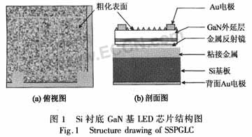 從結(jié)構(gòu)圖中看出,Si襯底芯片為倒裝薄膜結(jié)構(gòu),從下至上依次為背面Au電極、Si基板、粘接金屬、金屬反射鏡(p歐姆電極)、GaN外延層、粗化表面和Au電極。這種結(jié)構(gòu)芯片電流垂直分布,襯底熱導(dǎo)率高,可靠性高;發(fā)光層背面為金屬反射鏡,表面有粗化結(jié)構(gòu),取光效率高。[page]