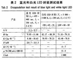根據(jù)LED的光學(xué)結(jié)構(gòu)及芯片、封裝材料的性能,建立了光學(xué)設(shè)計模型和軟件仿真手段,優(yōu)化了封裝的光學(xué)結(jié)構(gòu)設(shè)計。通過封裝工藝技術(shù)改進(jìn),減少了光的全反射,提高了產(chǎn)品的取光效率。改進(jìn)導(dǎo)電膠的點(diǎn)膠工藝方式,并對裝片設(shè)備工裝結(jié)構(gòu)與精度進(jìn)行了改進(jìn),采用電熱隔離封裝結(jié)構(gòu)和優(yōu)化的熱沉設(shè)計,降低了器件熱阻,提高了產(chǎn)品散熱性能。采用等離子清洗工藝,改善了LED封裝界面結(jié)合及可靠性。針對照明應(yīng)用對光源的光色特性的不同要求,研究暖白、日光白、冷白光LED顏色的影響因素:芯片參數(shù)、熒光粉性能、配方、用量,并通過改進(jìn)熒光膠涂覆工藝,提高了功率LED光色參數(shù)的控制能力,生產(chǎn)出與照明色域規(guī)范對檔的產(chǎn)品。藍(lán)光和白光LED封裝測試結(jié)果見表2。表中:φ為光通量;K為光效;P為光功率;R為熱阻;μ為光衰;I為飽和電流。