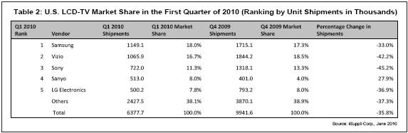 - 三星電子2010年第一季度在美國(guó)液晶電視市場(chǎng)奪回榜首位置