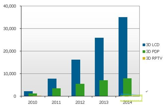 圖一:2010-2014 3D電視按不同應用技術(shù)出貨量預測(單位:千臺)