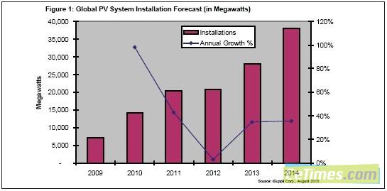 預計今年全球光伏裝機容量將增長到14.2GW,比2009年的7.2GW大增97.2%,而且也沒有明年降溫的跡象。圖1所示為2009-2014年全球光伏裝機容量預測,2014年新增光伏系統(tǒng)預計將達到38.1GW。