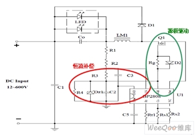 采用源極驅(qū)動,可以有效減少驅(qū)動電路電流消耗、降低功耗、提高效率;傳統(tǒng)的高壓差供電通路中為了將整流后的直流高壓降至PWM芯片所需要的低壓工作電壓,采用低阻大功率電阻降壓,器件發(fā)燙,自耗功率很大。