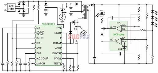 1)基于NCL30001的電流可調(diào)節(jié)恒流功率因數(shù)校正區(qū)域照明LED電源有些區(qū)域照明應(yīng)用場合要求提供帶輸入功率因數(shù)校正的隔離型穩(wěn)壓輸出電壓。這些應(yīng)用通常采用兩段式的電源轉(zhuǎn)換架構(gòu),其中的升壓功率因數(shù)校正(PFC)將交流輸入線路電壓轉(zhuǎn)換及預(yù)穩(wěn)壓為直流400V電壓,然后提供電壓給可以是任何適當(dāng)拓?fù)浣Y(jié)構(gòu)的常規(guī)直流-直流(DC-DC)轉(zhuǎn)換器(功率不超過150W的應(yīng)用中通常是反激轉(zhuǎn)換器)。