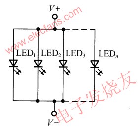 簡單并聯(lián)形式中的LED1~LEDn首尾并聯(lián),工作時每個LED承受的電壓相等。由LED的特性可見,其屬于電流型器件,加在LED上的電壓的微小變化都將引起電流的較大變化。此外,由于受到LED制造技術(shù)的限制,即使是同一批次的LED,其性能上的差異也是固有的,因此LED1~LEDn工作時,誰過每個LED的電流是不相等的。由此可見,每個LED電流分配的不均可能使電流過大的LED壽命銳減,甚至燒壞。這種連接方式雖然較為簡單。但是可靠性并不高,特別是對于LED數(shù)量較多情況下的應(yīng)用就更容易造成使用的故障。