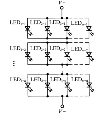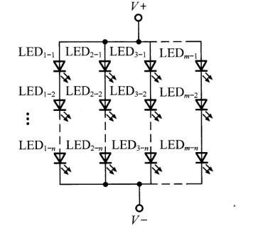 若干個LED先并后串的混聯(lián)形式如圖6所示。由于LED1-n~LEDm-n先并聯(lián)連接,提高了每組LED故障下的可靠性,但是由此一來每組并聯(lián)LED的均流問題就至關(guān)重要。為此,可以通過配對挑選,將工作電壓和電流盡量相同的LED作為并聯(lián)的一組,或者給每個LED串接小的均流電阻來解決。這種混聯(lián)形式具有的其他特點和存在的問題,與先串后并連接形式相類似。