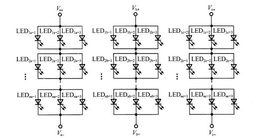 交叉陣列形式主要是為了提高LED工作的可靠性,降低故障率。主要構(gòu)成形式是:每串以3個LED為一組,分別接入驅(qū)動器輸出的Va、Vb、Vc輸出端。當(dāng)一串中的3個LED都正常時,3個LED同時發(fā)光;一旦其中一個或兩個LED失效開路時,可以保證至少有一個LED正常工作。這樣一來就能夠大大地提高每組LED發(fā)光的可靠性,也就能夠提高整個LED發(fā)光的總體可靠性。