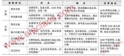不同的連接形式具有各自不同的特點,并且對驅(qū)動器的要求也不相同,特別是在單個LED發(fā)生故障時電路工作的情況、整體發(fā)光的可靠性、保證整體LED盡量能夠繼續(xù)工作的能力、減少總體LED的失效率等就顯得尤為重要。表1給出了采用不同連接形式時的相關(guān)情況的比較。