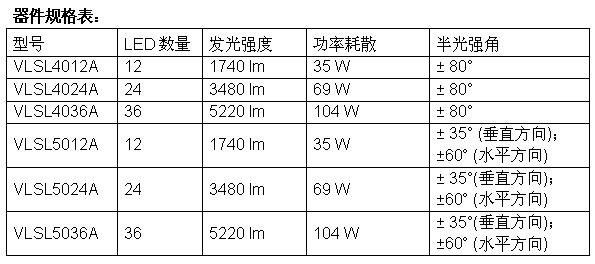 每個模塊皆配有12、24或36個高亮度LED,VLSL40xxA采用VLSL-REFL01反射鏡調(diào)整發(fā)光特性,而VLSL50xxA的發(fā)光呈蝶型。
