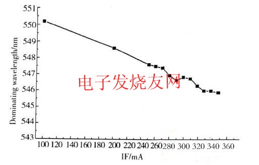 現(xiàn)在LED的發(fā)光顏色越來越豐富,LED的色坐標(biāo)參數(shù)是LED重要的物理參數(shù)之一,隨著注入電流的增加,器件出光的色坐標(biāo)在一定程度上減小,如圖1所示。
