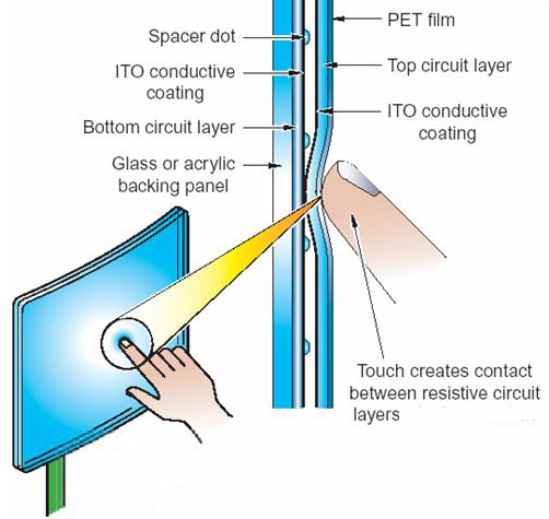 電阻式:從目前的推廣應(yīng)用來看,電阻式觸摸屏是占主導(dǎo)地位的觸摸技術(shù)。它由玻璃面板,銥錫氧化物(ITO)電阻涂層組成,并帶有導(dǎo)電涂層的護(hù)板,沿著邊緣有銀色的總線條。兩個層之間用絕緣小點隔開。觸摸屏幕時,護(hù)板彎曲與玻璃上的涂膜相接觸(圖1)。