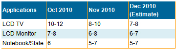 在美國,2010年第四季度零售市場銷售活躍,CCFL背光機種為主要熱銷產品,但該市場并未緩減所有品牌商的庫存壓力。大部分品牌商都仍面臨著LED背光液晶電視模塊居高不下的庫存問題。因此我們估計在2011年第一季度,品牌商將會趕在3月份新模塊上線前,加大促銷力度重點投放LED背光液晶電視。在中國,截止12月末,假期期間良好的銷售有效地減緩了庫存壓力,我們估計液晶電視庫存將在12月底降低到中等水平。