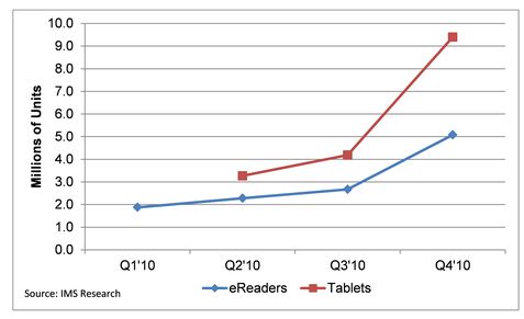 報(bào)告顯示,在2010年的假期中,平板電腦和電子書(shū)閱讀器的市場(chǎng)十分火爆。電子書(shū)閱讀器出貨量在2010年第四季度相比于第三季度增長(zhǎng)了90%,而全年的增長(zhǎng)量為116%,銷(xiāo)量達(dá)到了510萬(wàn)臺(tái),其中亞馬遜的Kindle和Barnes & Noble公司的NOOK成為了最大贏家。