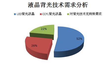 根據(jù)賽迪網(wǎng)對(duì)350位網(wǎng)友所作的調(diào)查顯示,在購(gòu)買顯示器的時(shí)候,考慮LED產(chǎn)品的有182位,占52%。依舊會(huì)考慮CCFL產(chǎn)品的有91位,占26%,而表示不關(guān)心背光技術(shù)的有77位,占22%。而在1年多以前類似的調(diào)查當(dāng)中,表示會(huì)選購(gòu)LED產(chǎn)品的用戶比例還不足25%。由此,很多廠商甚至已經(jīng)在產(chǎn)品線上實(shí)現(xiàn)了全部LED化。而隨著LED產(chǎn)品價(jià)格的進(jìn)一步走低,在未來(lái)一到兩年之內(nèi),CCFL產(chǎn)品很有可能會(huì)被完全取代。