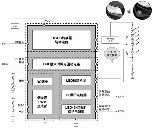最近,汽車用前照燈正在逐漸推進(jìn)LED化,以高效、長壽這一優(yōu)點為背景,未來有望成為前照燈市場的重心。此外為確保車輛安全、可見度,安裝使用LED前照燈的事例會不斷增加,而未來預(yù)計LED前照燈/DRL的搭載也將面向車載用途形成標(biāo)準(zhǔn)規(guī)格系列。目前,LED前照燈只限于高級豪華車等一部分的車型上選用,對汽車制造商、前照燈制造商來說,多采用延用通用的LED驅(qū)動IC,或以分立元器件為主構(gòu)成的形式,如果裝載DRL就需要另外配備與其相配的驅(qū)動電路。羅姆針對未來前照燈的LED化,率先著手開發(fā)了一款專用的IC,并推動獲得前照燈用LED驅(qū)動器所需功能的專用IC的開發(fā)。此次羅姆新開發(fā)的這種前照燈專用LED驅(qū)動IC,特別面向歐美等國先行開始普及的DRL,通過內(nèi)置振蕩器電路實現(xiàn)微處理器控制的PWM調(diào)光。另外,為對應(yīng)要求高可靠性的車載市場需求,在搭載能監(jiān)測LED短路、LED開路等前照燈故障的各種保護(hù)功能,與分裝器件構(gòu)成時或與通用的LED驅(qū)動IC組成時的情況相比,通過削減部件數(shù)量從而實現(xiàn)了可靠性的大幅提高。另外,絕對最大電壓設(shè)定為50V,對于鋰離子電池電壓波動也能非常輕松地承受的高耐壓化也得以實現(xiàn)。